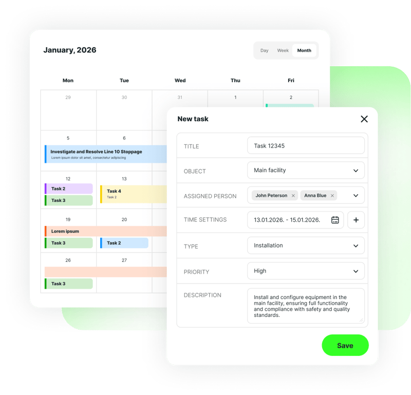 A fully integrated workflow that connects data to action across the entire organization. From the moment a sensor detects a deviation, a task is created, assigned, completed, and logged - ensuring faster decisions, reduced downtime, and measurable improvement.